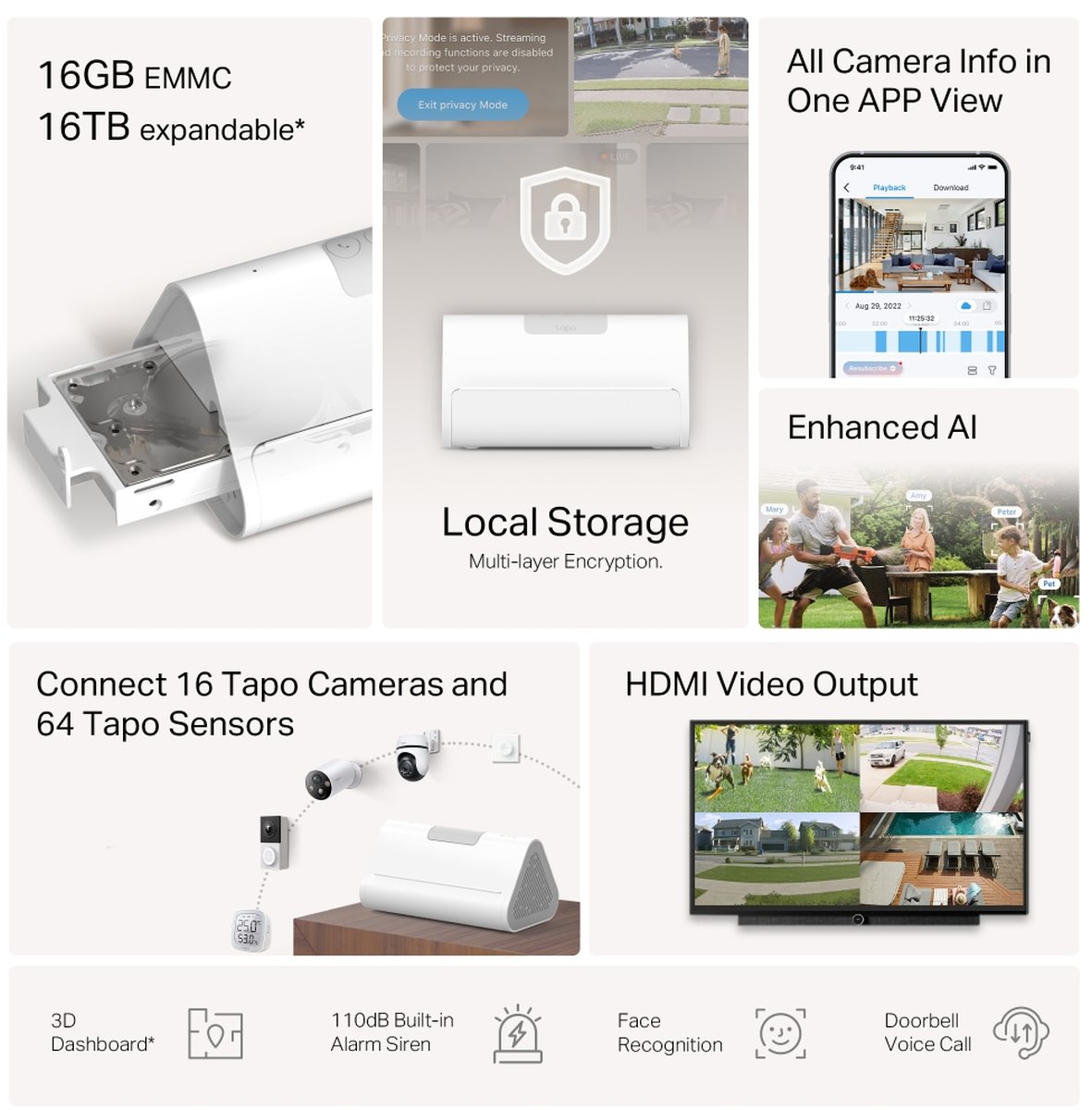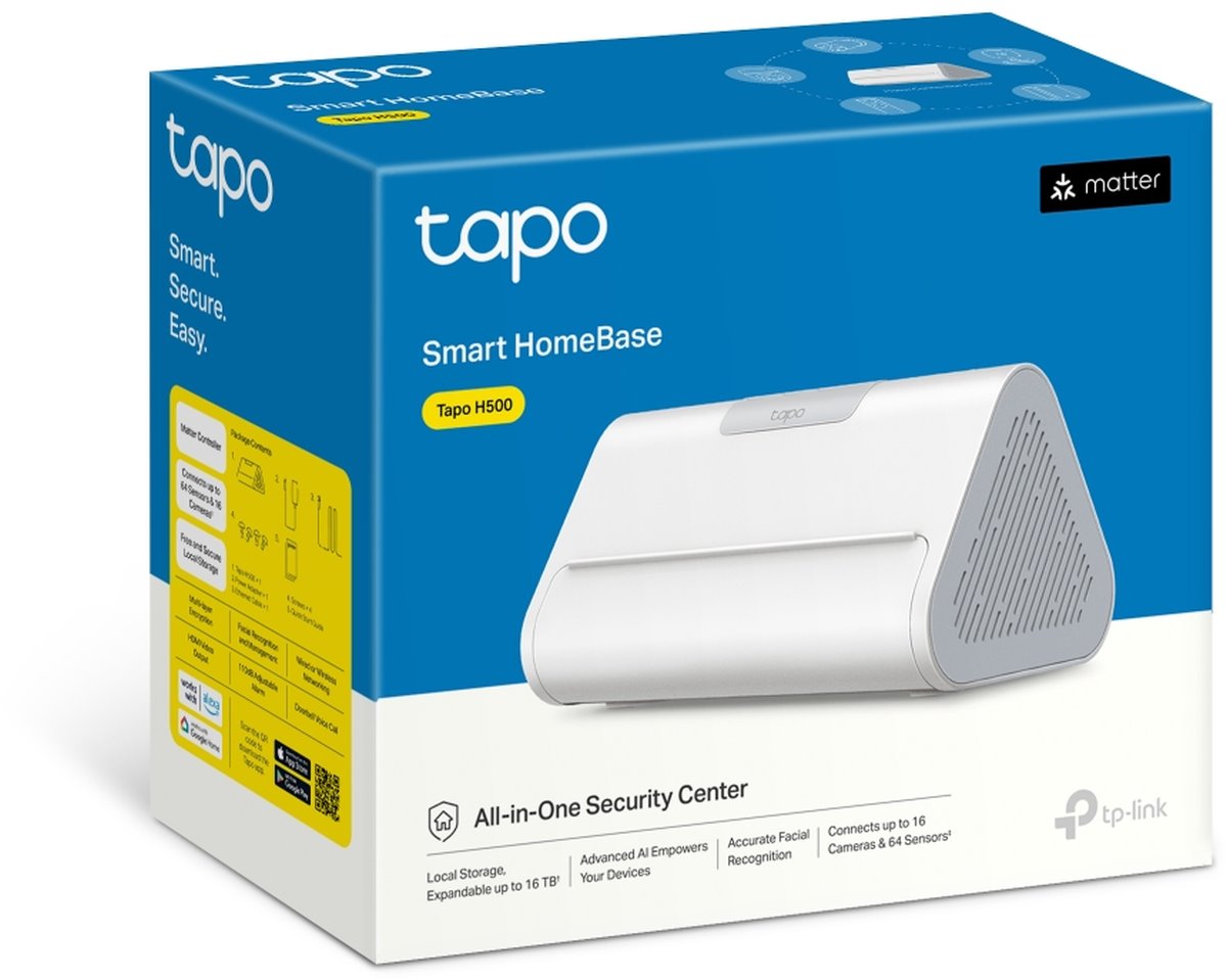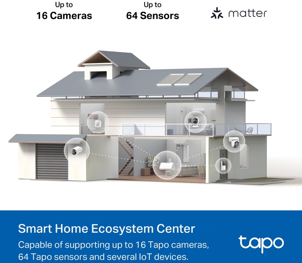 Tapo H500 umožňuje připojení a správu až 64 senzorů a 16 kamer. Podpora zařízení s certifikací "Matter" včetně Tapo zařízení.
