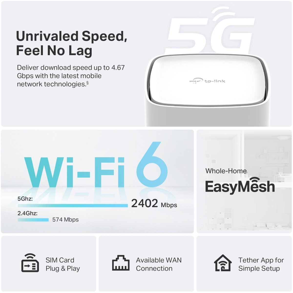 Zařízení snadno zapojíte díky Plug & Play. Jen vložíte kartu SIM a hned můžete využívat 5G síť. Kromě toho je router kompatibilní s technologií EasyMesh. Spolupracuje se stejně kompatibilními produkty. Díky tomu si vytvoříte jednotnou síť pod jedním názvem Wi-Fi, která pokryje celou domácnost.