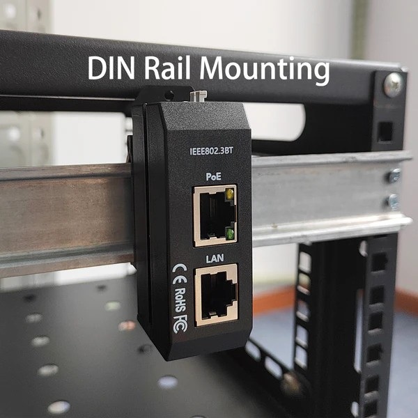 Zařízeni lze instalovat na zeď či na DIN lištu pomocí dodávaného DIN klipu na těle injektoru.