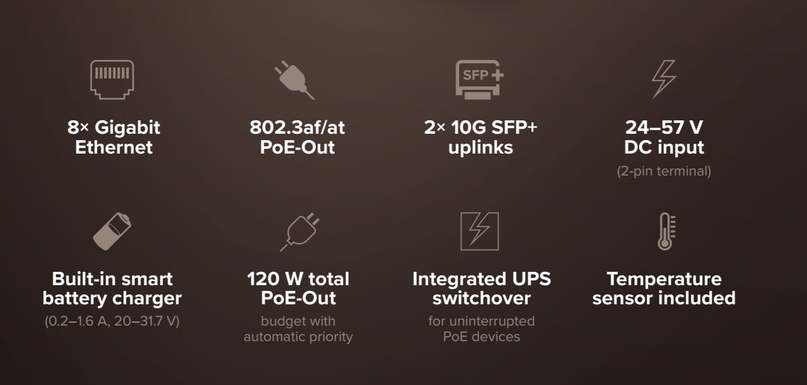 Kompaktní PoE switch s integrovanou UPS a inteligentní nabíječkou baterií – garance bezvýpadkového provozu CCTV kamer a přístupových bodů při výpadích napájení.