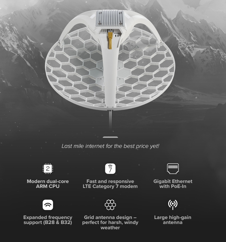 Je vybavena směrovou anténou s vysokým ziskem 17dBi a modemem CAT7 LTE s rychlostí nahrávání až 100 Mbps, což zajišťuje vyšší výkon a lepší odezvu ve venkovských oblastech.