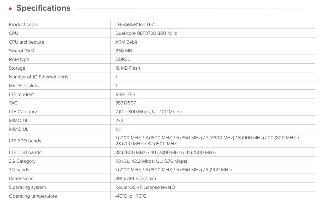 LTE Category: 7 (DL: 300 Mbps; UL: 100 Mbps)